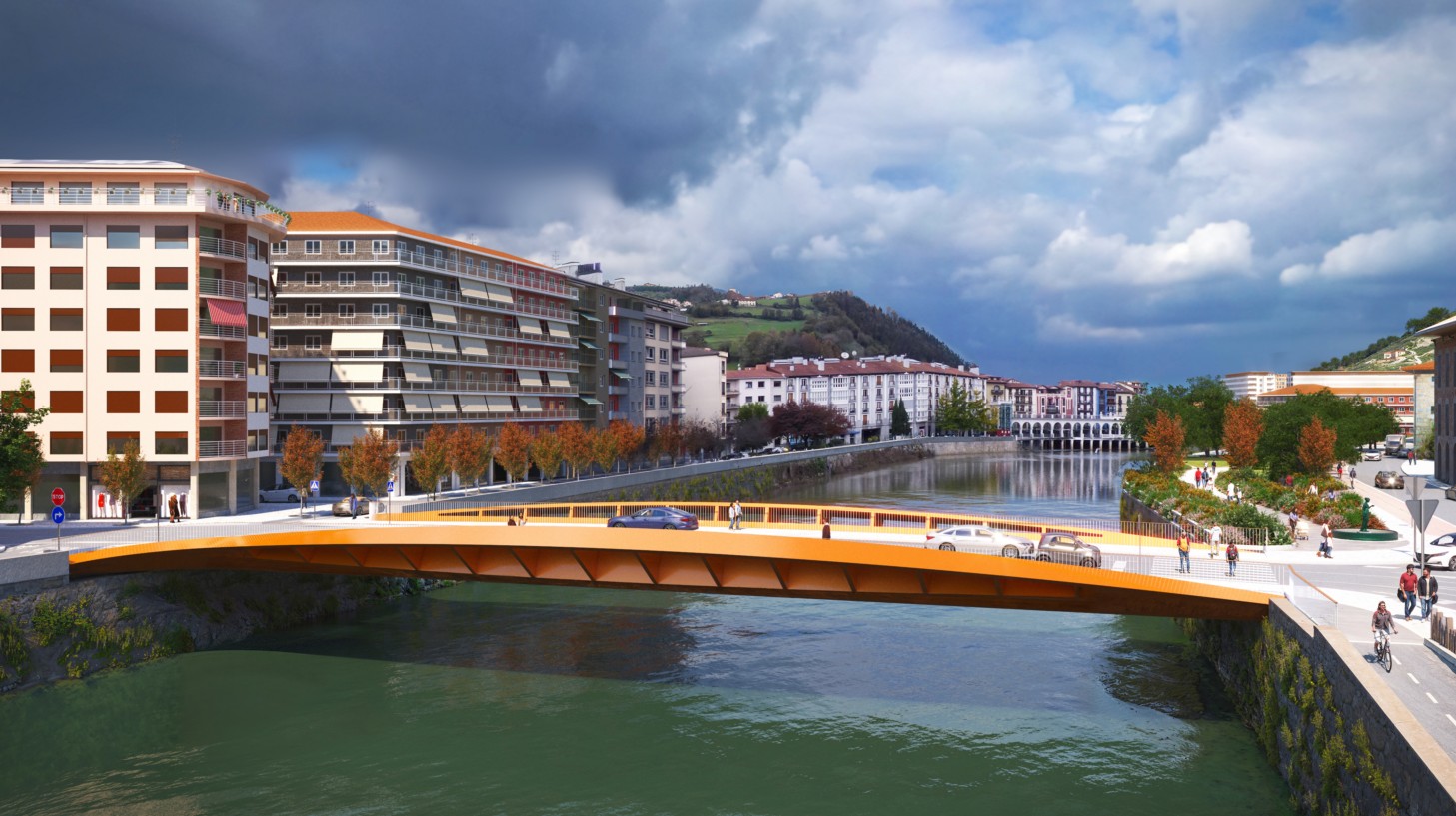 Se propone un puente sin columnas, de un solo vano. Asimismo, cuenta con una estructura por encima de la calzada para conseguir la máxima protección hidráulica en cuanto a superficie de agua y evitar futuras inundaciones. Se basa en dos vigas principales curvadas en alzado similar a una ‘silueta de peces'. Desde cualquier acera del puente se mantienen las líneas oculares del entorno. También da solución a la falta de espacio en la orilla izquierda.