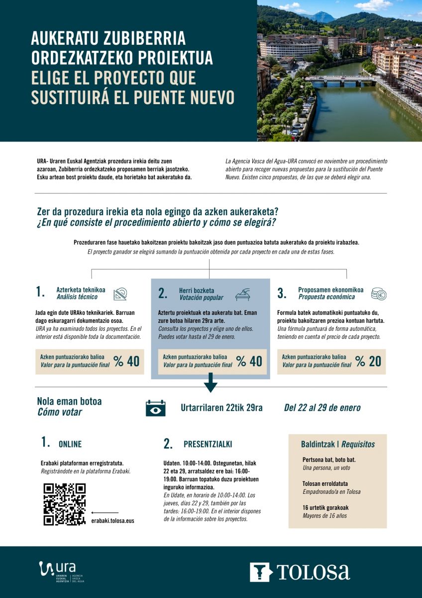 El plazo para votar comenzará mañana, jueves 22 de enero, y finalizará el día 29. Los requisitos para votar son tres: estar empadronado/a en Tolosa, tener más de 16 años, y emitir un solo voto por persona. Se podrá votar de dos formas:
