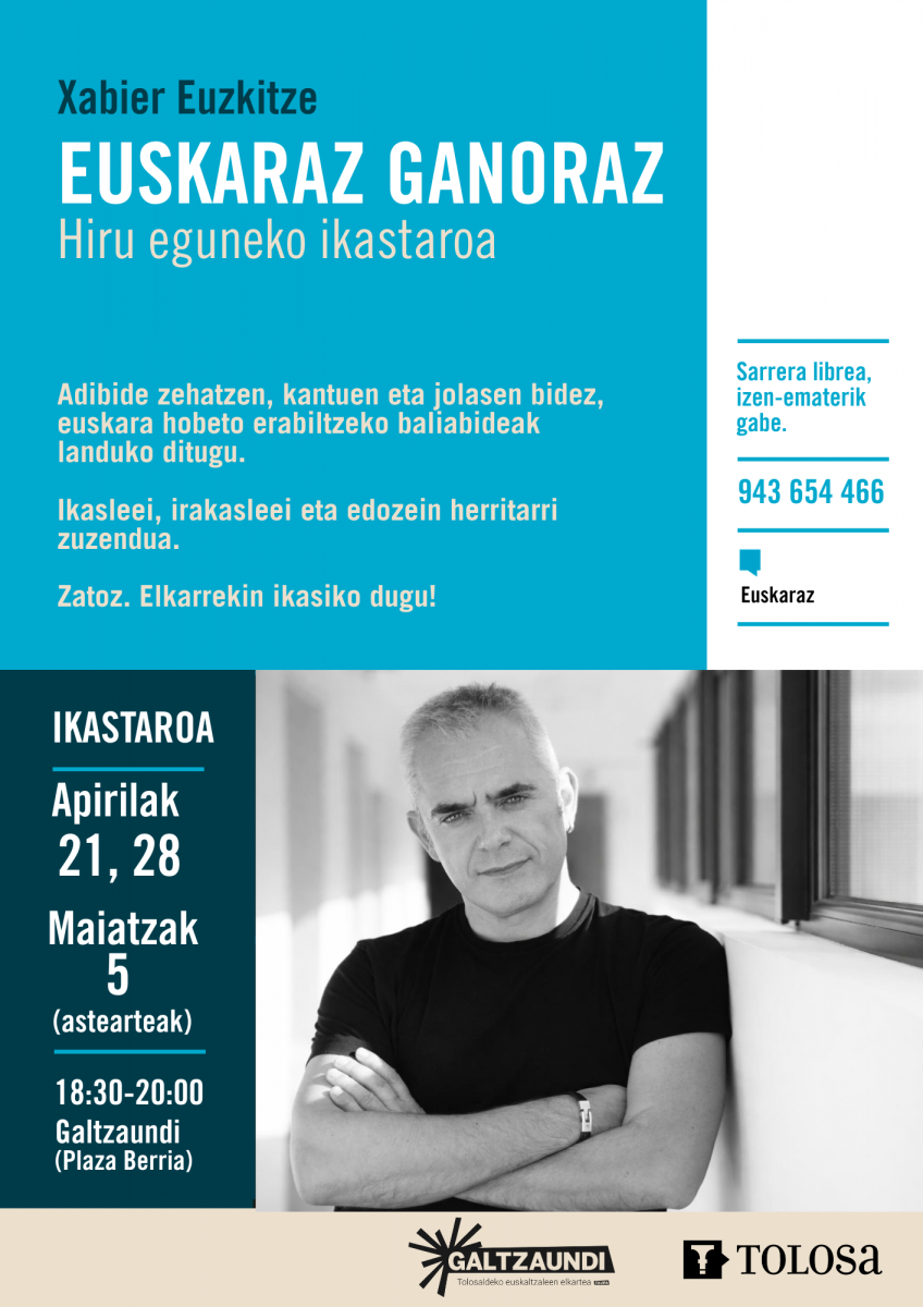 Euskaldunen eguneroko euskara hobetzeko helburuarekin, Euskaraz ganoraz ikastaroa emango du Xabier Euzkitzek. Tolosako Udalak antolatu du ikastaroa, Galtzaundi Tolosaldeko Euskaltzaleen Elkartearen laguntzaz. Hiru asteartetan izango dira saioak (apirilaren 21ean, apirilaren 28an eta maiatzaren 5ean), 18:30etik 20:00etara. Galtzaundiren egoitzan egingo dituzte hiru saioak, Plaza Berrian. Doako ikastaroa izango da, eta ez dago izena eman beharrik.