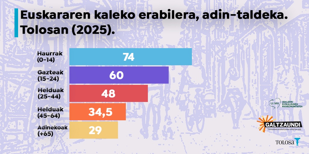 Joera argia da: zenbat eta gazteago, euskaraz gehiago. Tolosako kaleetan umeak aritzen dira euskaraz gehien (%74), eta adinekoak gutxien (%29). Diferentzia handia dago adin-taldearen arabera. Izatez, 2025eko neurketan izan den jaitsiera lotua dago helduekin eta adinekoekin: horien erabilera jaitsi da; umeen erabilerak gorantz jarraitzen du, eta gazteen erabilerak eutsi egin dio. Bilakaera historikoari erreparatuta, nabarmentzekoa da nolako aldaketak gertatu diren: 40 urtean ia bikoiztu egin da umeen erabilera, eta gazteena, hirukoiztu; helduen erabilera ere nabarmen hazi da, ia bikoiztu, eta adinekoen erabilera antzeko neurrian dago. Bestela esanda, 1980ko hamarkadan umeek eta adinekoek egiten zuten euskaraz gehien, antzeko neurrian, eta gazteek gutxien; orain, haurrek eta gazteek egiten dute gehien, asko hazita.