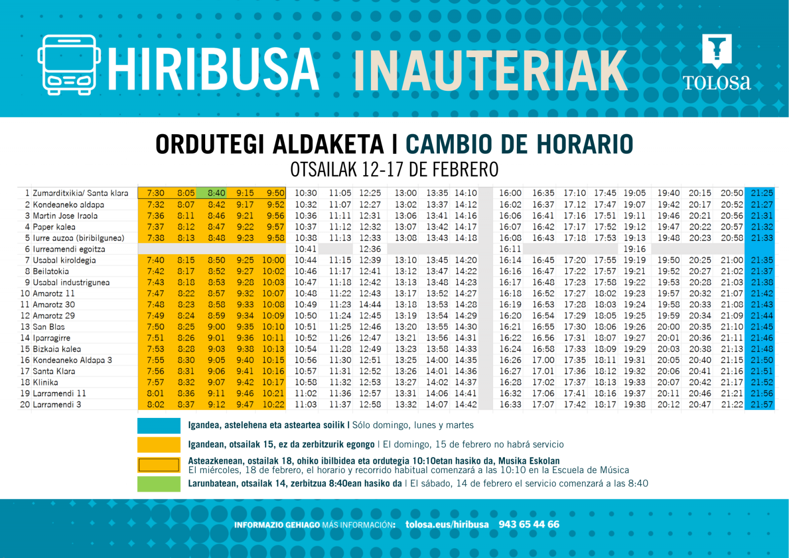 Bestetik, aldaketa horrek ordutegian eragingo du. Inauterietan ohikoa den moduan, 07:30ean hasiko du zerbitzua egunero, larunbatean eta igandean izan ezik. Larunbatean 08:40ean izango da lehen zerbitzua; igandean, 10:30etik aurrera. Igandean, astelehenean eta asteartean, berriz, zerbitzua luzatu egingo du: 21:25ean aterako da eguneko azken autobusa, eta 21:57an amaitu. Honakoa izango da Hiribusaren ordutegi berezia inauterietan: