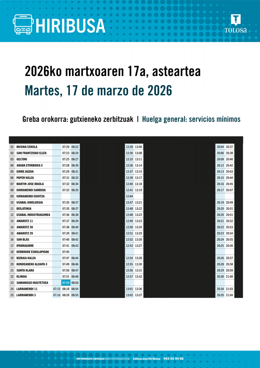 Garraioan, ohiko zerbitzuen % 30 emango da. Hiribusaren kasuan, esaterako, 07:20, 08:22, 12:28, 13:06, 20:04 eta 20:37ko orduetan izango da gutxieneko zerbitzua. Bihar, hortaz, honako ordutegi hau egingo du.